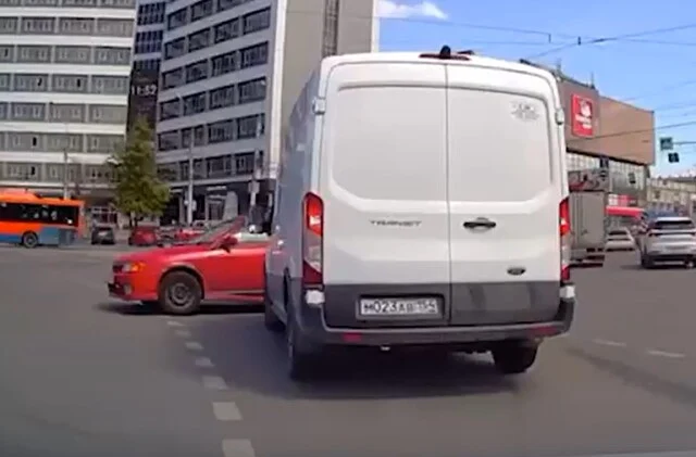 Авария произошла в Новосибирске на площади Калинина. Столкнулись фургон Ford Transit и красный универсал. Происшествие попало в объектив видеорегистратора очевидца.