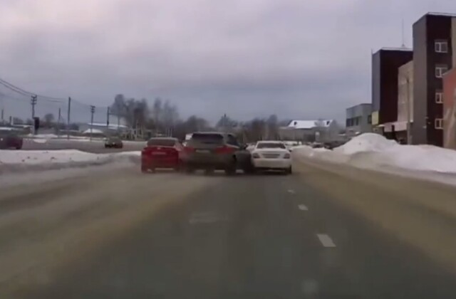 ДТП произошло на Промышленном шоссе в Ярославле. Водитель кроссовера, двигаясь по левой полосе, пытался избежать столкновения с притормозившим автомобилем и подбил двигавшуюся в попутном направлении легковушку.