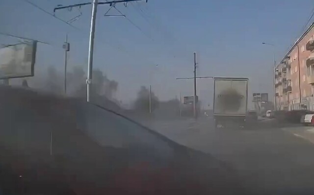 В Улан-Удэ водитель красной иномарки поворачивал налево на перекрестке и из-за выхлопных газов от грузовика не заметил автомобиль, в котором установлен видеорегистратор.