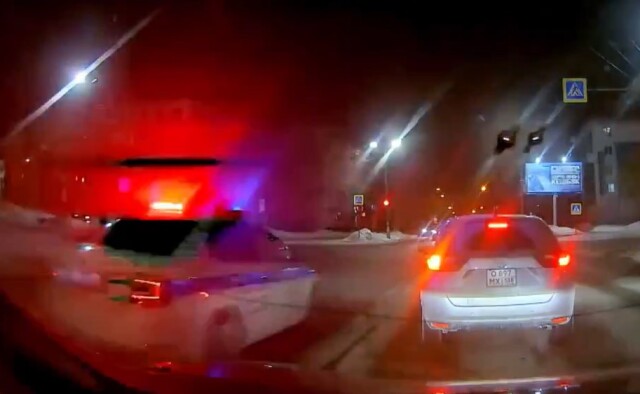 ДТП произошло в Ангарске на перекрестке улиц Алешина и Енисейской. По предварительным данным, водитель автомобиля ДПС, двигавшийся с включенными проблесковыми маячками и звуковым сигналом, проехал перекресток по встречной полосе на запрещающий сигнал светофора и совершил столкновение с Toyota Mark II, водитель которого также выехал на перекресток на красный.