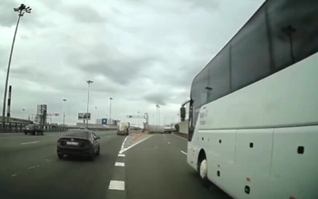 Санкт-Петербург. Водитель автомобиля с видеорегистратором и водитель автобуса намереваются повернуть направо, но что-то им мешает спокойно это сделать. Как вы считаете, кто был бы виноват в ДТП, если бы транспортные средства столкнулись?