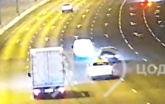 Очередное ДТП произошло на МКАД. На 62 километре автомагистрали водитель легкового автомобиля при перестроении в правую полосу не заметил фургон и совершил с ним столкновение. Момент столкновения зафиксировали камеры.