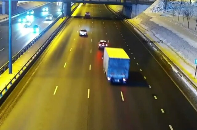 ДТП произошло на МСД в районе 8-й улицы Соколиной горы. Водитель фургона при перестроении столкнулся со стоящей посреди дороги легковушкой, которую от удара отбросило на ограждение. Момент столкновения зафиксировала камера ЦОДД.