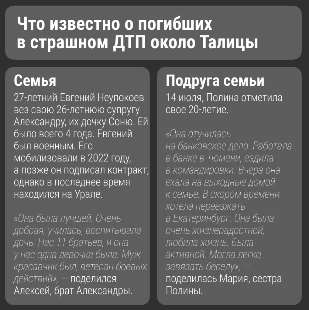 В результате ДТП погибли 4 человека, находившиеся в легковом автомобиле: 27-летний водитель, его 26-летняя супруга, их 4-летняя дочь и 20-летняя подруга семьи.