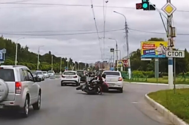 ДТП произошло в Новочебоксарске. Мотоциклист пытался повернуть направо с левой полосы, столкнулся с автомобилем Renault Logan и опрокинулся. Момент столкновения запечатлел видеорегистратор очевидца.