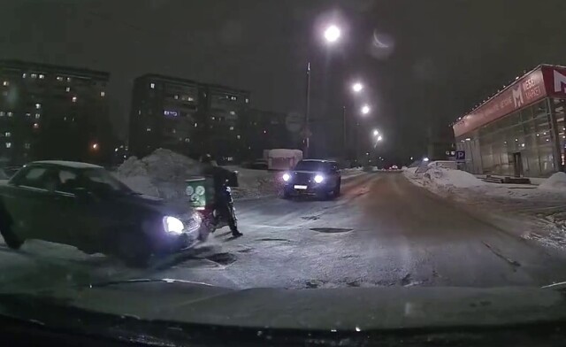 Вчера на перекрестке Хейконена — 1-ый Внутриквартальный проезд в Петрозаводске «Лада Приора» подбила доставщика еды и скрылась. Момент столкновения запечатлел видеорегистратор очевидца.