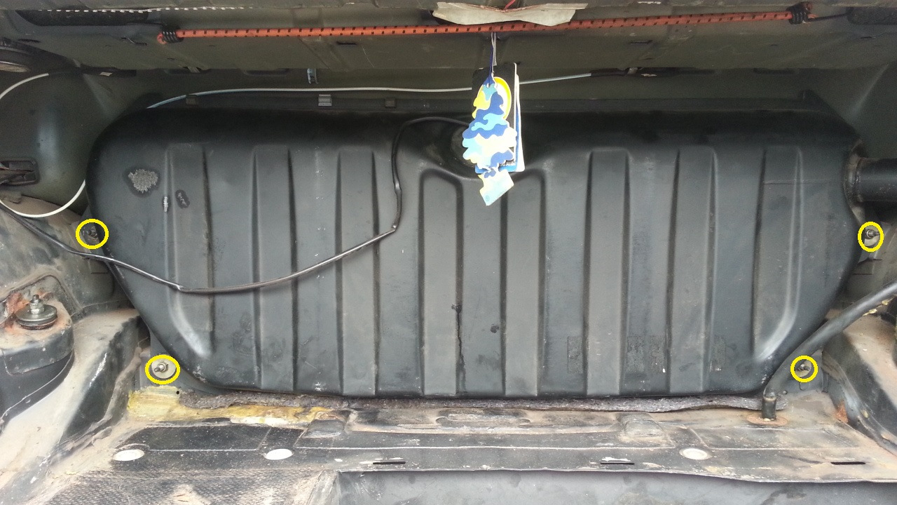 Снятие бака: Всю обивку снимать не надо — во втором(маленьком по объему) лючке, по краям войлока, снять 4 пистона и поднять ковролин, отцепить провода датчика топлива. Правую оббивку снимать тоже не надо, достаточно открыть. Снять вентиляционный шланг, открутив хомут. Снять глушитель(открутить один хомут и снять с весюлек). Снять термоэкран глушителя(пять болтов под ключ на 8). Снизу отцепить шланги топлива(2 шт.). Четыре болта не в багажнике, а под багажником, и крутить надо не болты, а гайки — болты вварены). Ключом на 13 открутить спереди-снизу бака 2 гайки. Тоже сзади по краям 2 шт. Средние гайки не трогать. Тянуть на себя не надо — бак вниз падает сам. Место течи надо определять когда бак с топливом на машине, т.к. для накачивания и для затыкания всех отверстий не хватит рук. Огнетушитель вещь полезная. Но у меня дизель — паял прямо с солярой в баке 200 ВАТТНЫМ паяльником с ортофосфорной кислотой припоем ПОС61(обычный), предварительно место пайки зачистить и высушить. Потом вымазал место пайки эпоксидкой, чтобы не ржавел бак. Геморой со сливом топлива — все слить не получается даже когда бак в руках — «спецконструкция». Прошло полгода уже и все лады.