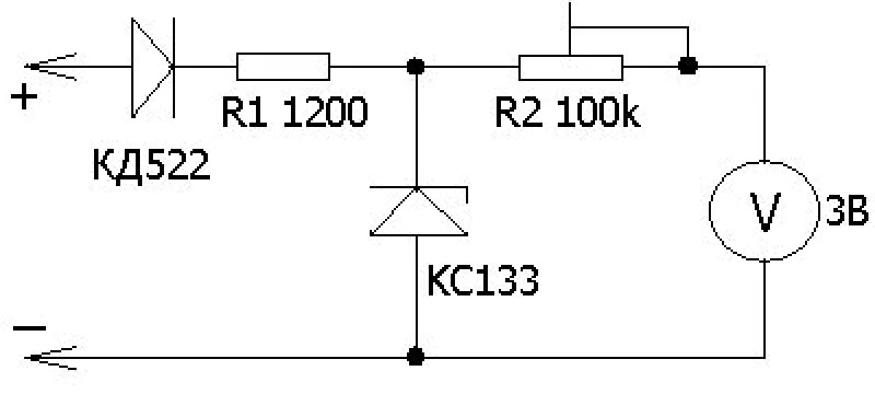 Идея измерения очень проста. Если на вольтметр со шкалой 3В подать 0В, он покажет 0В (или 0%). Если на него подать 3В, он покажет 3В (или 100%). Если на него подать прямоугольный сигнал размахом 3В и скважностью 50% (то есть половину периода будет 3В и половину будет 0В), то прибор покажет 1,5В (или 50%). Для того, чтобы показания прибора зависели только от скважности и не зависели от размаха сигнала, используется стабилитрон. На него через резистор R1 (для настройки тока стабилитрона) подается сигнал размахом 9-14В, а на нем будет всегда присутсвовать сигнал размахом 3,3В. Резистор R2 используется для того, чтобы настроить максимальное отклонение стрелки прибора (на стабилитроне 3,3В, а головка на 3В). Диод используется для защиты от обратной полярности. В качестве измерительной головки не обязательно исползовать головку именно на 3В, а можно использовать любую на максимальное напряжение не более 9В. При этом нужно использовать стабилитрон с напряжением стабилизации равным или немного больше максимального напряжения головки. Я использовал головку на 7,5В, стабилитрон КС175 (7,5В). Так как напряжение головки и стабилитрона совпадают, я не использовал R2. Сопротивление R1 — 1200 Ом. Для того, чтобы производить измерения, нужно разметить шкалу прибора в процентах. Для этого его нужно разобрать. Не подавая на прибор сигнал, подстроить «0» прибора винтом на головке. Это будет 0%. Затем нужно подключить прибор к АКБ. Стрелка отклонится на максимальное положение. Это будет 100%. Затем нужно разбить шкалу на 10 равных участков. Это будут 10%, 20% и тд. При измерении Л-характеристики следует иметь в виду, что прибор нужно подключать следующим образом. (+) прибора подключается к цепи 30 (ножка 6 диагразъема) или 15 (ножка 5), а (-) к диагностическому сигналу на круглом диагразъеме (ножка 3). Этим же прибором можно измерять сигнал на регуляторе холостого хода.