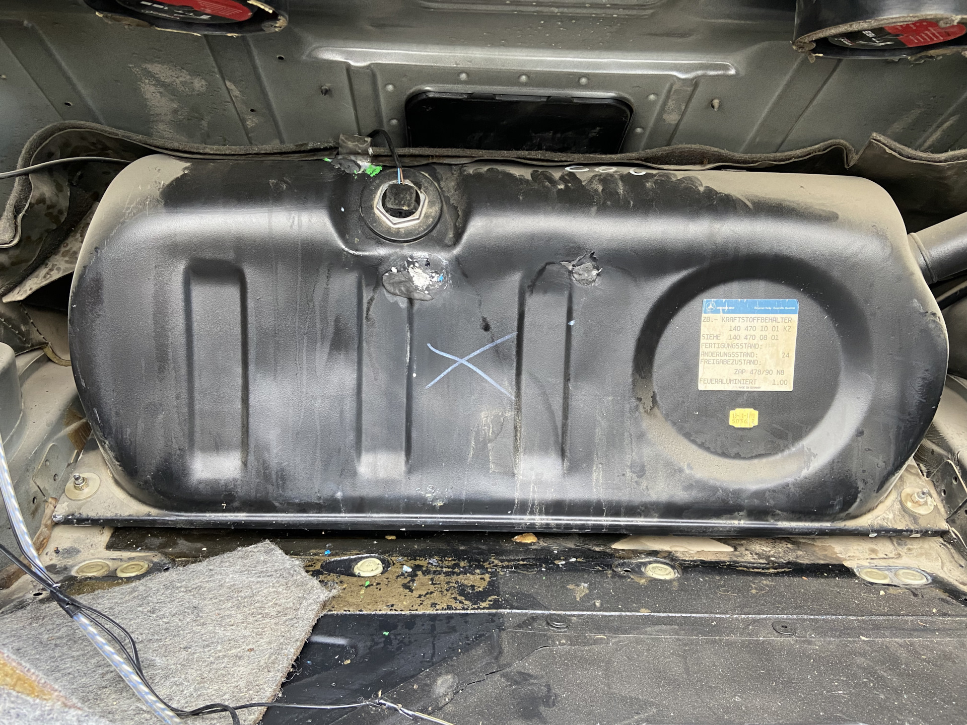 Из-за забитого адсорбера вентиляция бака нарушается и его «плющит» как банку от Кока-колы. В сервисе рекомендуют сменить бак на б/у ($250), но мы простых путей не ищем. Искатав бензин по максимуму, загоняем машину на яму. Снимаем обшивку багажника.Вынимаем шумоизоляцию между баком и стенкой салона (для визуального контроля формы бака). Под машиной отсоединяем основной топливопровод от фильтра (справа по ходу движения). Глушим. Слева по ходу движения машины отсоединяем шланг вентиляции бака. Глушим. Отсоединяем шланг обратки. Вместо него присоединяем шланг компрессора (Мустанг вполне сдюжит). Дальше работаем с напарником. Включаем компрессор и начинаем надувать бак. Напарник визуально контролирует процесс. Когда бак надулся полностью, напарник открывает заливную горловину для сброса давления. Сборка в обратной последовательности. Выправить можно практически любой бак. Мой был сплющен настолько, что был треугольной формы, вмещал 30-40 литров топлива (вместо 100). К тому-же убился датчик топлива...