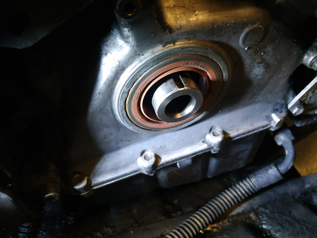 Самое интересное в процессе замены сальника — открутить болт шкива коленвала. Можно воспользоваться следующим методом: сделать что-нибудь, чтобы машина не завелась (например, открутить "-" от бензонасосов, завести машину и подождать, пока заглохнет). На болт надевается головка с длинной трубой, конец которой упирается в стену ямы. Точнее, нужно дать ему размах сантиметров 5. Затем болт срывается стартером: придерживаем трубу руками (осторожно, чтобы в случае чего руки не поотрывало).Просим помощника крутнуть на 0,5 сек. (не больше!) стартер. Труба с размаху бьется в стену ямы, и срывает болт. Чтобы снять шкив КВ, нужно снять шкив вискомуфты. Далее расшатываем его монтировочкой и стаскиваем на себя. Если сидит совсем плотно, снимаем радиатор, и спрессовываем съемником. Еще из «узких мест» можно отметить шпонку на КВ, которая может упасть в маслинный поддон. В моем случае шпонка сидела плотно, не стал ее даже вынимать. Расположена она напротив метки ВМТ. При установке шкива важно проследить, чтобы она не слетела и не упала в поддон. А дальше просто. Монтировкой через лючок держим маховик за шляпку болта (которая под ключ на 13мм), накручиваем динамометрический ключ на 400 НМ, или, на худой конец, берем длинную трубу. Помощник держит маховик во время затяжки болта.