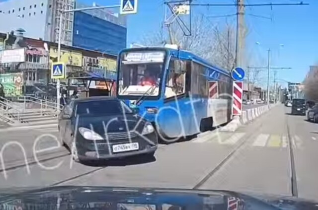 ДТП произошло в Иркутске на перекрестке Партизанская — Красных Мадьяр. Водитель легкового автомобиля при повороте налево не заметил трамвай. От удара легковушку развернуло. Происшествие попало в объектив видеорегистратора очевидца.