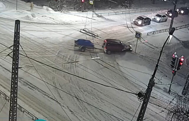 В Петрозаводске на пересечении Первомайского проспекта и улицы Московской водитель «Нивы» с прицепом пытался проскочить перекресток на желтый, не вписался в поворот и снёс дорожный знак.