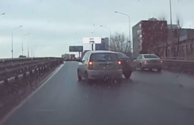 В Тюмени на путепроводе по улице Пермякова водитель хетчбэка при перестроении столкнулся с двигавшимся в попутном направлении седаном. Происшествие попало в объектив видеорегистратора очевидца.