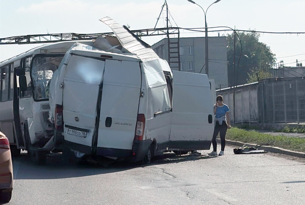 ДТП произошло вчера на улице Маяковского в Ижевске. Автобус ПАЗ снёс выезжавший со второстепенной фургон Fiat и протащил его несколько метров.