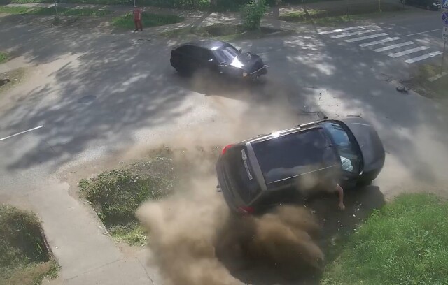 ДТП произошло на перекрестке Энгельса — Луначарского в удмуртском городе Глазове. Столкнулись два автомобиля, один из которых вылетел с дороги и перевернулся. Момент столкновения запечатлела камера уличного наблюдения.