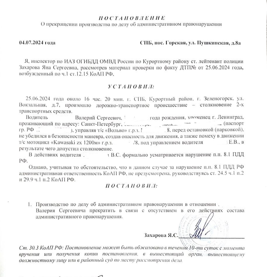 В итоге инспектор ДПС вынес водителю Volvo постановление по п.8.1 ПДД РФ с формулировкой «Не убедился в безопасности маневра, создав опасность для движения мотоциклу Кавасаки».