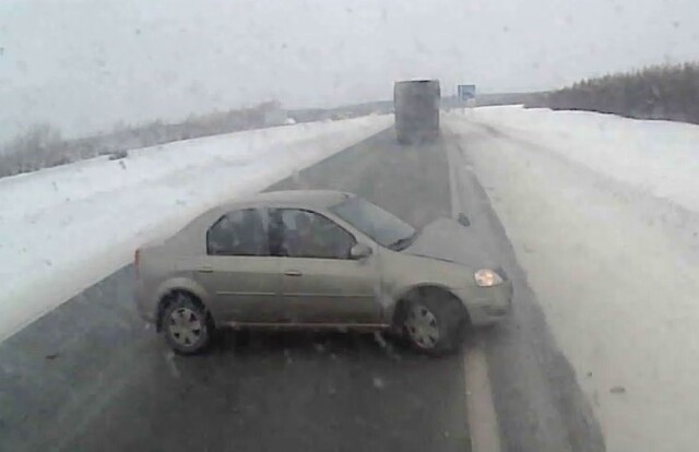 ДТП на трассе М-7 под Казанью. По словам автора, девушка на «Логане» ехала в аэропорт и столкнулась со снегоуборочной техникой, после чего в неё врезался грузовик с видеорегистратором. В результате происшествия пострадавших нет.