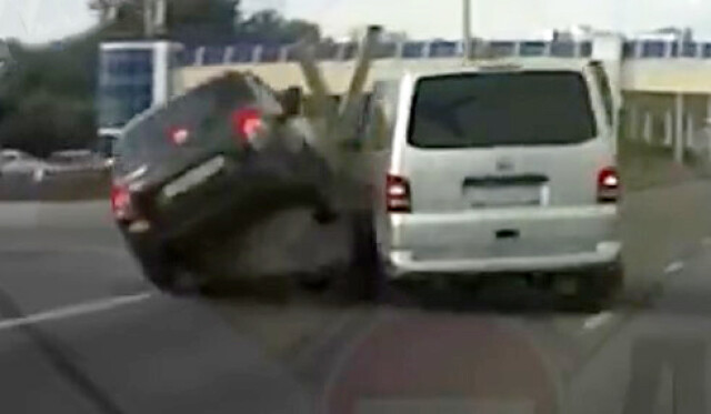 ДТП произошло перед Бельским мостом в Уфе. Водитель микроавтобуса поворачивал налево с правой полосы и подбил автомобиль, который двигался слева. От удара легковушка перевернулась. Момент столкновения запечатлел видеорегистратор очевидца.