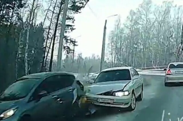 Авария в Иркутском районе по пути в Березовый. Водитель седана на повороте не успел затормозить и въехал в хетчбэк, который притормозил. Момент столкновения попал в объектив видеорегистратора в встречной машины.