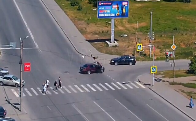 ДТП произошло возле остановки Стахановская в Бийске Алтайского края. Мотоциклист проехал перекресток на красный и столкнулся с автомобилем, который двигался на зелёный. Происшествие попало в объектив камеры уличного наблюдения.