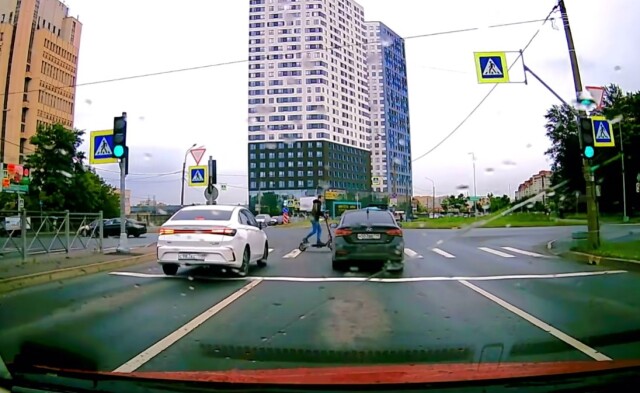 На улице Ленсовета в Санкт-Петербурге. Самокатчик пытался проехать на красный и попал под колеса автомобиля, который двигался на разрешающий сигнал светофора. Момент ДТП попал в объектив видеорегистратора очевидца.