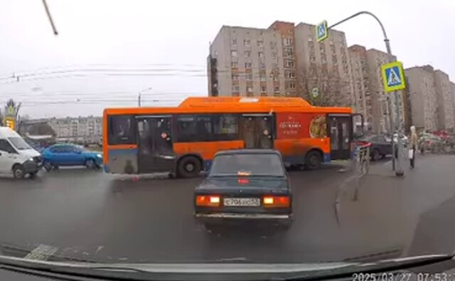 ДТП произошло на перекрёстке Кочетова — Корсунова в Великом Новгороде. Водитель автобуса не успел затормозить и въехал в стоящую в пробке легковушку. Происшествие попало в объектив видеорегистратора очевидца.