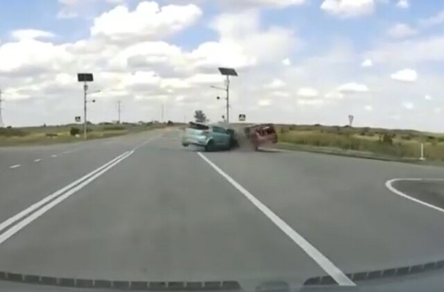 ДТП произошло возле станицы Луганская. На перекрестке столкнулись два автомобиля. О пострадавших не сообщается. Момент столкновения запечатлел видеорегистратор очевидца.