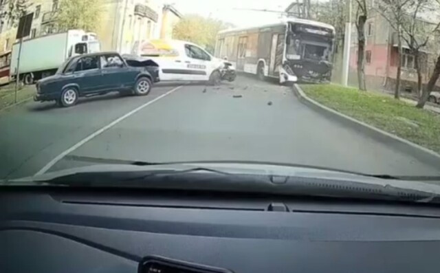 Два легковых автомобиля и электробус столкнулись на перекрестке в Красноярске