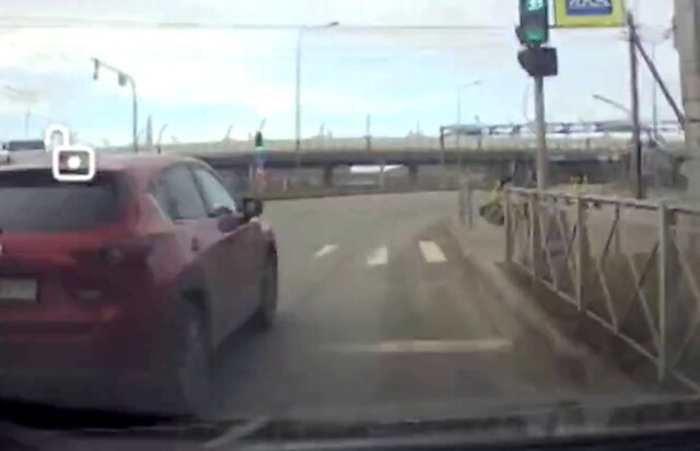 Авария в Петербурге. По словам водителя автомобиля с видеорегистратором, он двигался в попутном направлении, но человек на красной «Мазде» его просто прижал и всё.