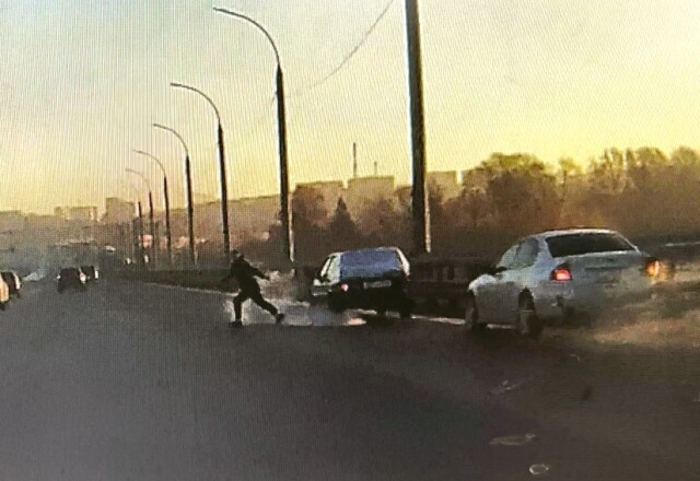 Мужчина едва успел отбежать в сторону за секунду до столкновения и не пострадал. Видеорегистратор запечатлел момент ДТП.