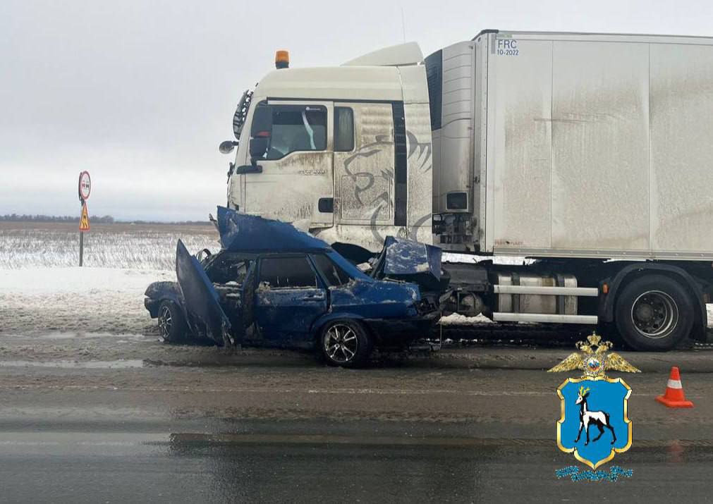 ДТП произошло 8 января в 10:55 утра на 60 километре обводной автодороги Самары в Волжском районе Самарской области. Водитель автомобиля ВАЗ-2199 выехал на встречную полосу и столкнулся с большегрузом Sitrak, который перевозил шампанское.