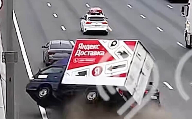ДТП произошло 3 сентября на МКАД. Водитель кроссовера при перестроении столкнулся с фургоном, который от удара потерял управление и опрокинулся. Момент столкновения запечатлели камеры.