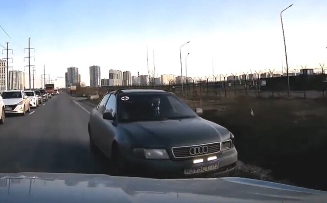 В Санкт-Петербурге из-за ДТП с участием автобуса образовалась пробка, в результате чего водителям пришлось объезжать препятствие на дороге. Водитель Audi решил не стоять в пробке, выехал на встречную полосу и столкнулся с автомобилем, в котором установлен видеорегистратор.