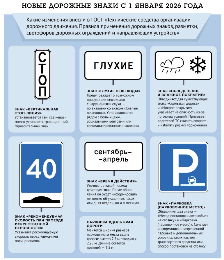 Знак «Рекомендуемая скорость при проезде искусственной неровности». Знаки, обозначающие зону с ограничением остановки. Объединенный знак «Место стоянки», в котором уже указан способ постановки машины на парковку Объединенный знак «Влажное/заснеженное покрытие». Новая табличка «Глухие пешеходы». Новая табличка «Время действия знаков по месяцам» Возможность установки вертикальной «Стоп-линии».Кроме того, произойдут важные изменения в организации движения: будет запрещена опасная схема работы светофоров с одновременным разрешающим сигналом для поворота налево и встречного потока.