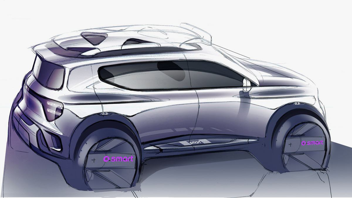 На изображениях виден кроссовер с более «оквадраченными» формами по сравнению с smart #1 и smart #3. У нарисованной новинки весьма солидный дорожный просвет, большие колёса, расширенные колёсные арки с пластиковыми накладками на них, а также почти вертикальная багажная дверь, на верхней части которой размещён спойлер. Ещё на корме можно разглядеть фонари, которые соединены друг с другом перемычкой, а выше находится название бренда.