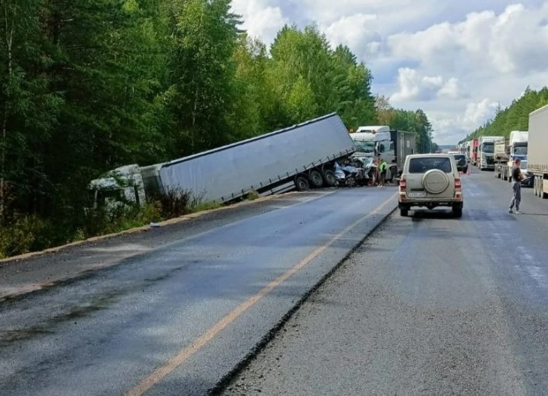 ДТП произошло сегодня, 17 августа, на 267 километре трассы Екатеринбург — Тюмень в Свердловской области. Возле Тугулыма в месте проведения дорожных работ контейнеровоз Sitrak столкнулся с автомобилем Chery, который отбросило на большегрузную фуру MAN.