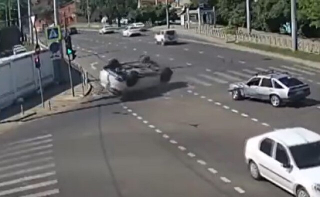 Кроссовер перевернулся на крышу в результате ДТП в Краснодаре