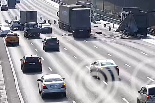 Курьезная авария на МКАД: грузовик растерял покрышки после столкновения с самосвалом