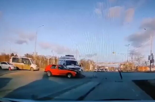 На видео видно, как водитель скорой осторожно проезжал перекресток, но водитель легковушки его не заметил.