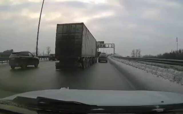 Момент ДТП на КАД: фура столкнулась с легковым автомобилем, после чего в неё въехал «Газон»