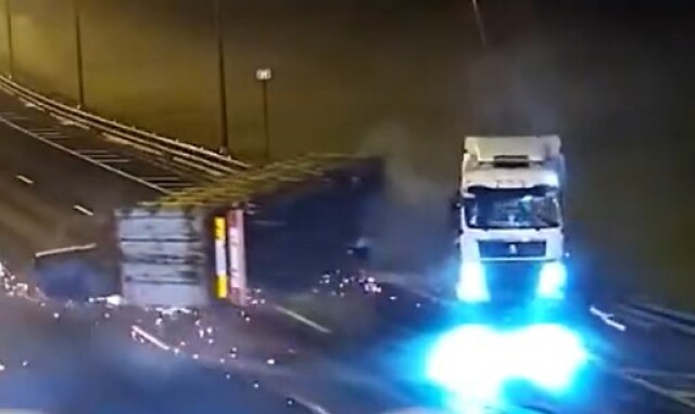 Момент ДТП на МКАД: у большегруза на ходу лопнуло колесо
