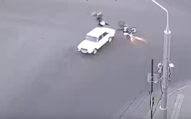 ДТП в Красноярске на перекрестке Мира — Сурикова. Водитель «Жигулей» поворачивал налево с правой полосы и столкнулся с мотоциклом. Происшествие попало в объектив камеры уличного наблюдения.