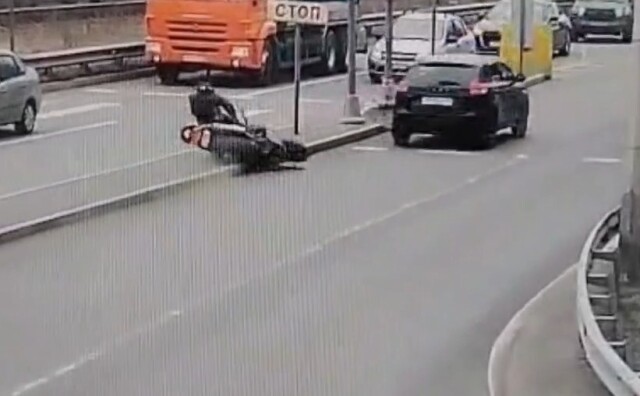 Момент ДТП в Петербурге: женщина на «Ладе» подрезала мотоциклиста и скрылась