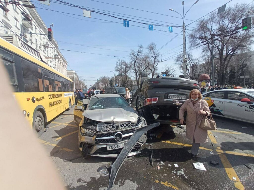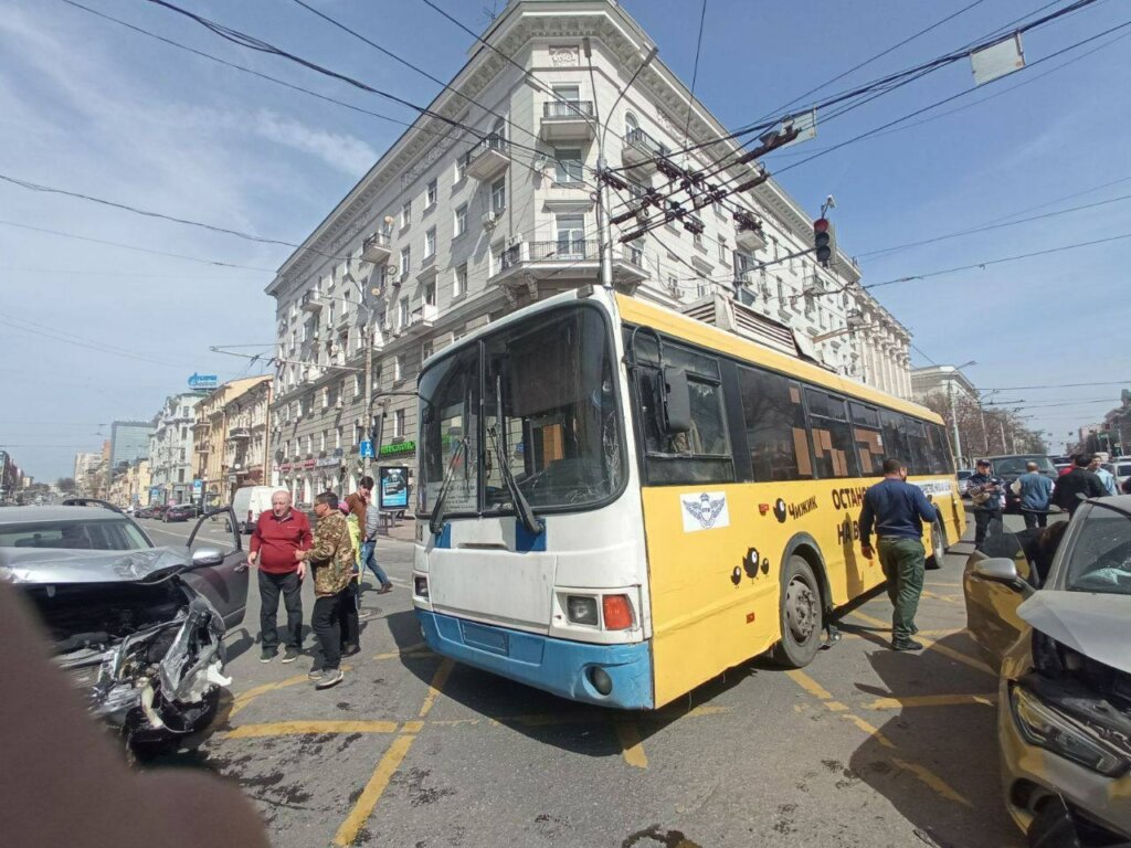 Массовое ДТП произошло 1 апреля на пересечении Ворошиловского проспекта и Большой Садовой улицы в Ростове-на-Дону. 75-летний водитель автомобиля Subaru хотел проскочить перекресток красный и столкнулся с автомобилями Chevrolet и Mercedes, а также троллейбусом.