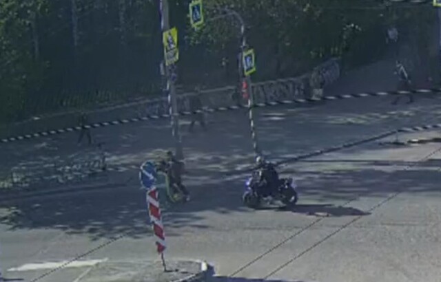 ДТП произошло в Екатеринбурге на пересечении улиц Мира и Малышева. Мотоциклист сбил самокатчика, который пересекал проезжую часть по пешеходному переходу. Момент столкновения попал в объектив камеры.