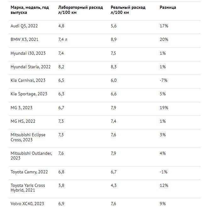 В частности, автомобили Audi Q5, BMW X3, MG 3 и Volvo XC40 потребляют на 17%, 20%, 19% и 9% больше топлива соответственно, чем указано в паспорте.