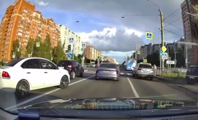 Вполне частая дорожная ситуация — оба водителя перестраиваются в одну полосу, в результате чего происходит столкновение. Однако, на видео видно, что оба пересекают сплошную полосу, тем самым нарушая ПДД.