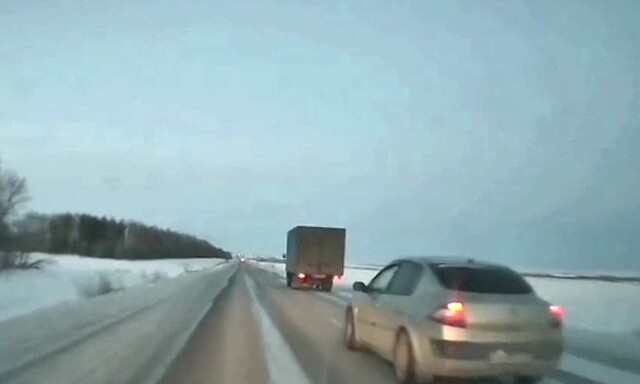 ДТП на трассе в Челябинской области. Водитель автомобиля с видеорегистратором решил обогнать двигавшиеся впереди машины, но помешал ему в этом водитель «Мегана», который также пошел на обгон. В итоге автор потерял управление и врезался в грузовик, после его оба оказались в кювете. О пострадавших не сообщается.