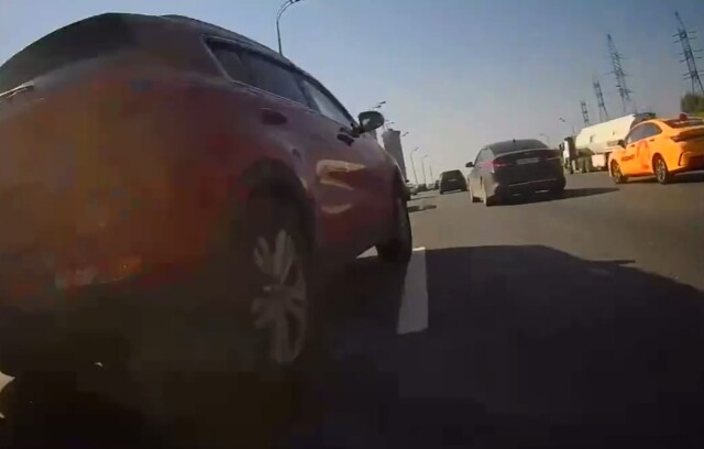 ДТП на 69 километре МКАД. Мотоцикл двигался по внешней стороне автодороги и по касательной столкнулся с попутным кроссовером, водитель которого хотел перестроиться. В результате происшествия мотоциклист не пострадал.