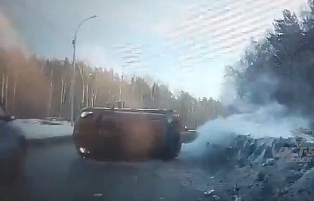 ДТП на Бердском шоссе в Новосибирске. Столкнулись Mazda Familia и Nissan March. От удара «Ниссан» опрокинулся на бок. Происшествие попало в объектив видеорегистратора участника аварии.